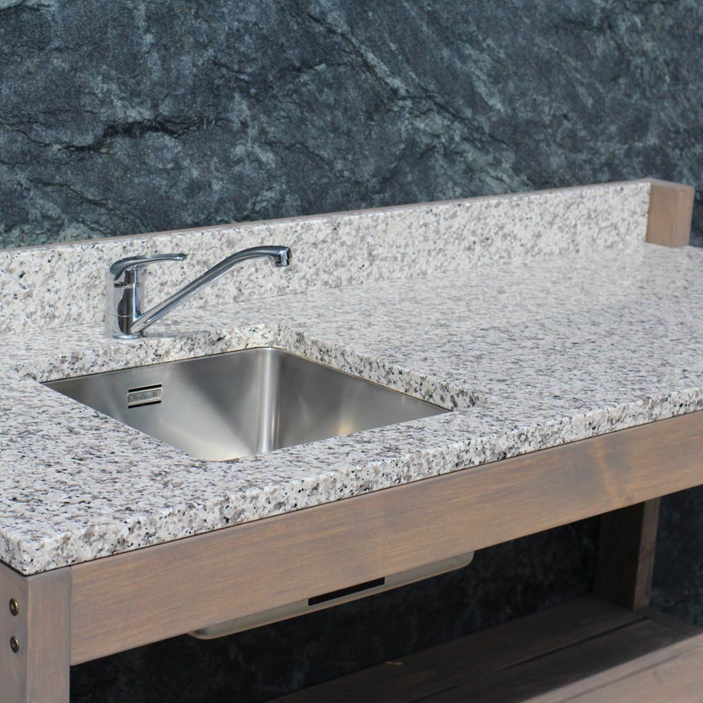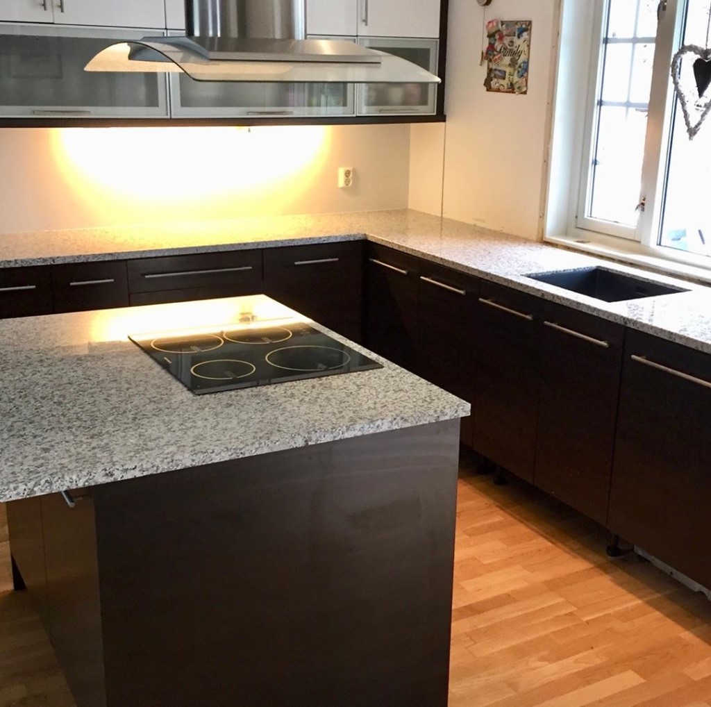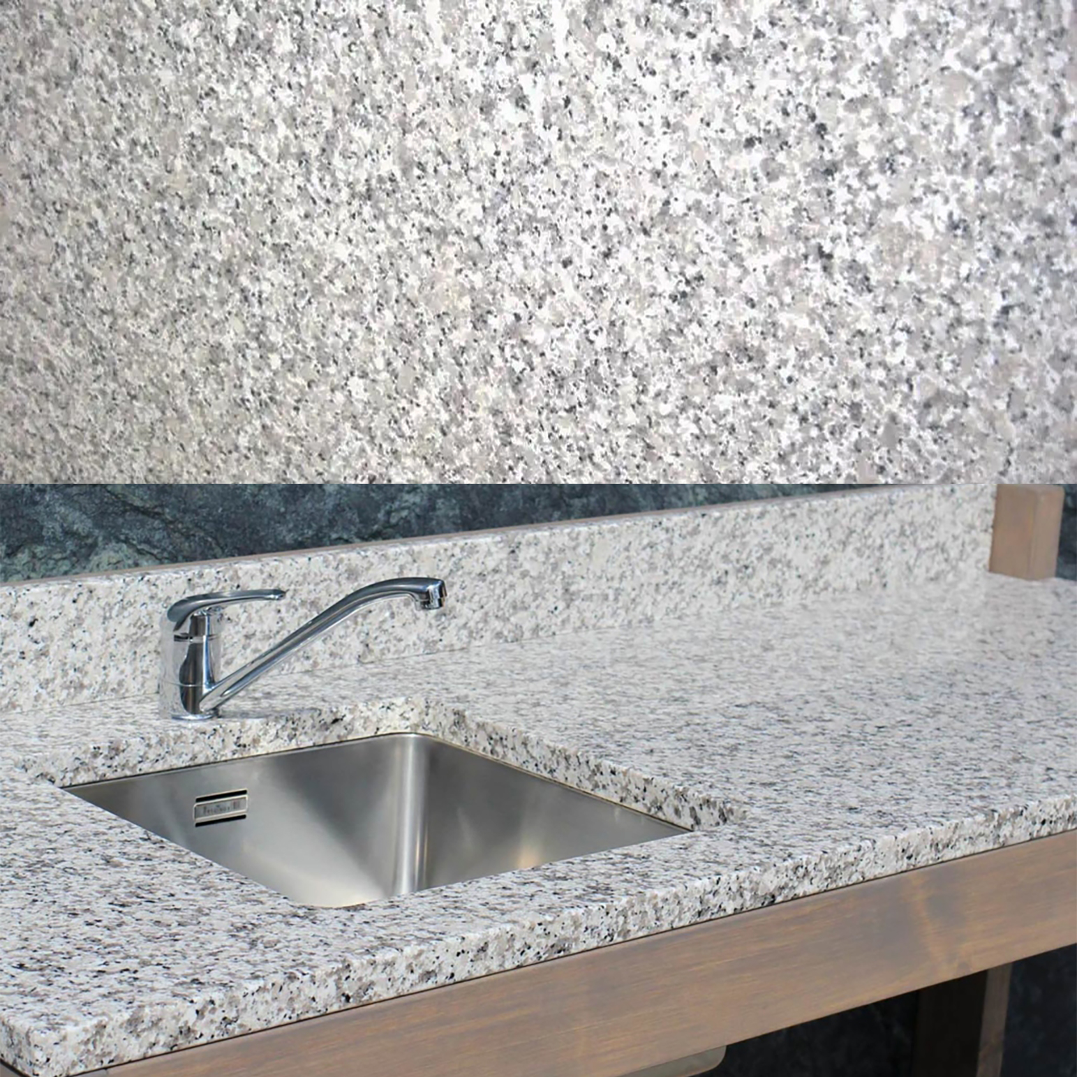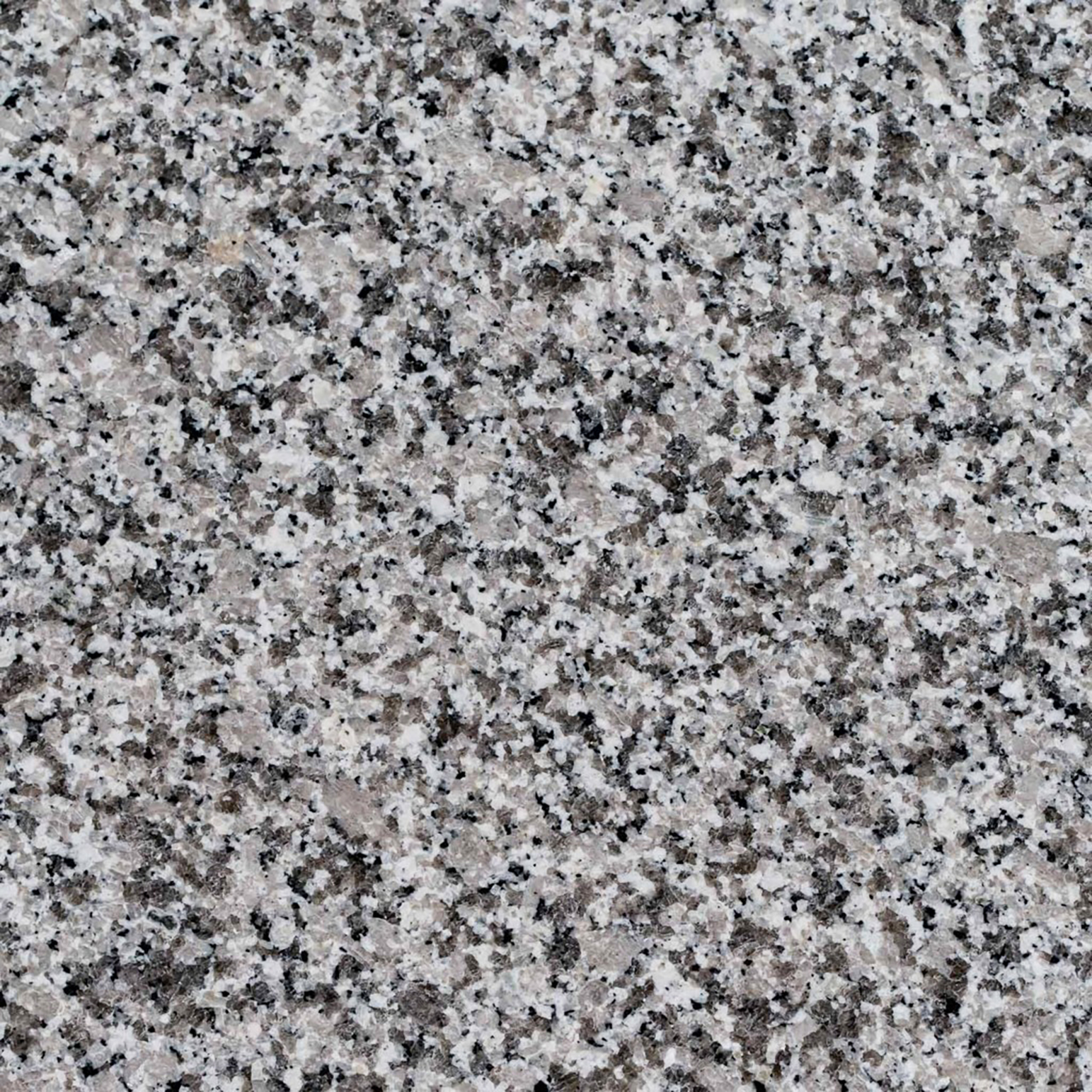 Lys granit, med et farvespil af hvid, beige, brun og lidt sort.