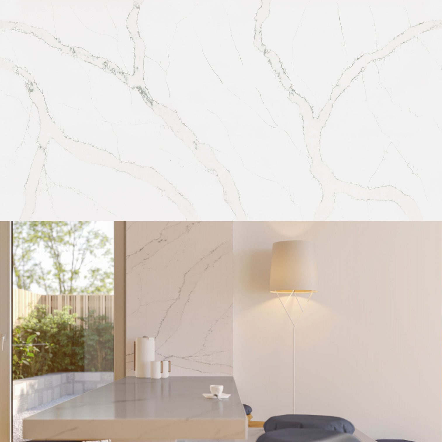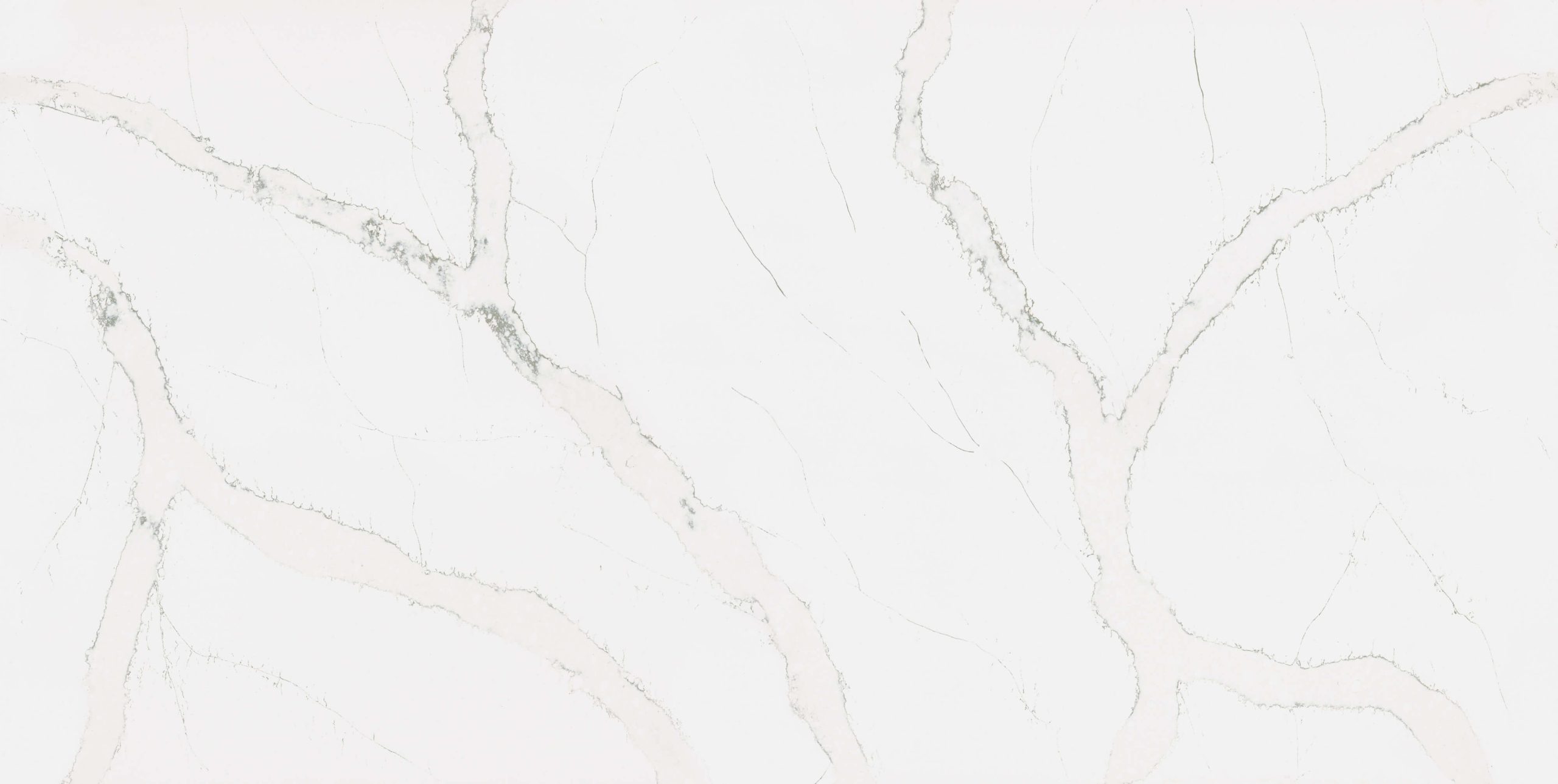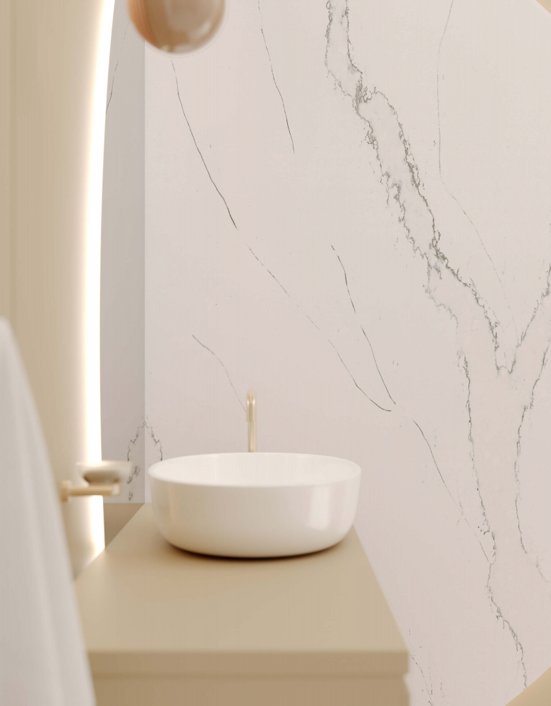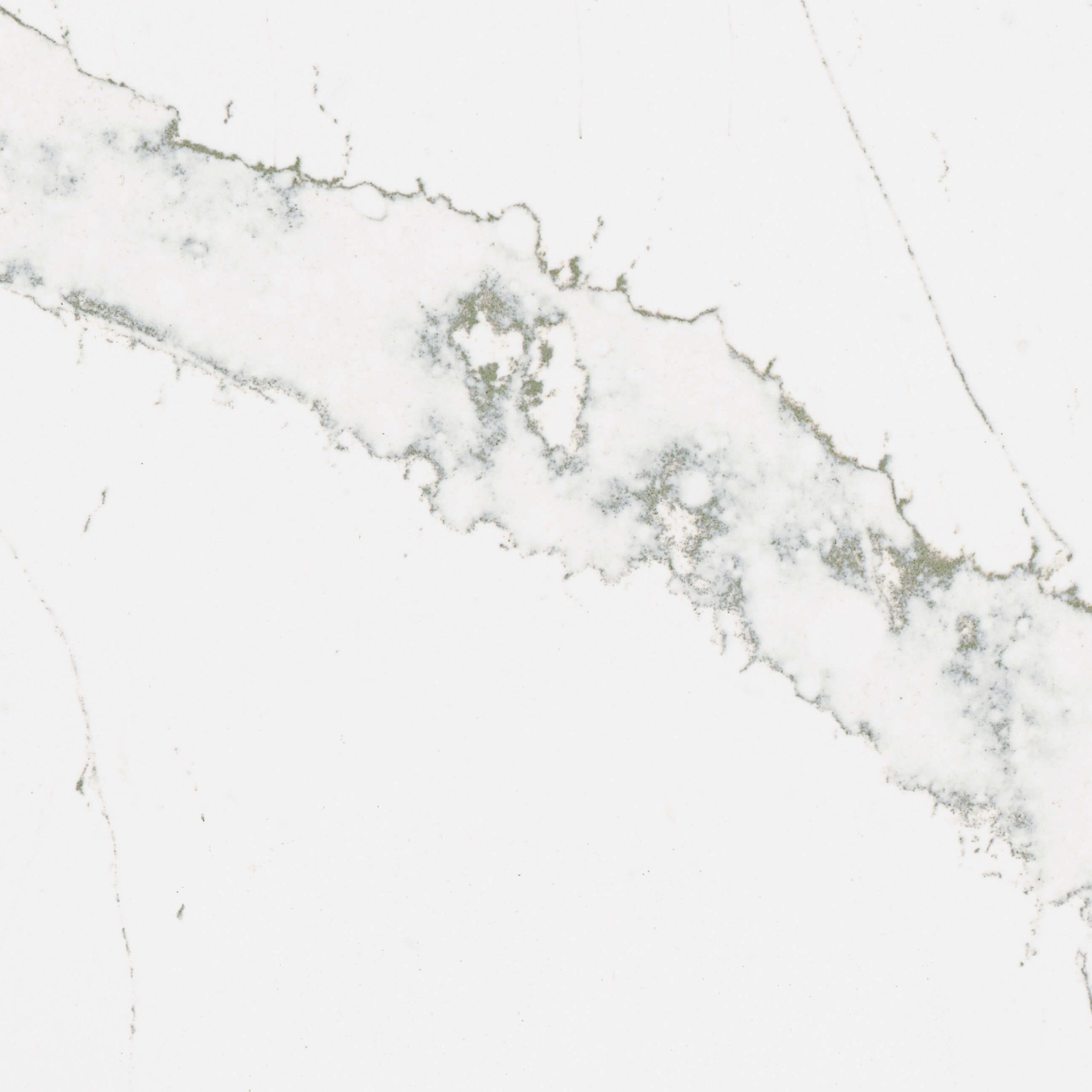 Hvid kvartskomposit med store lyse salviegrønne årer.