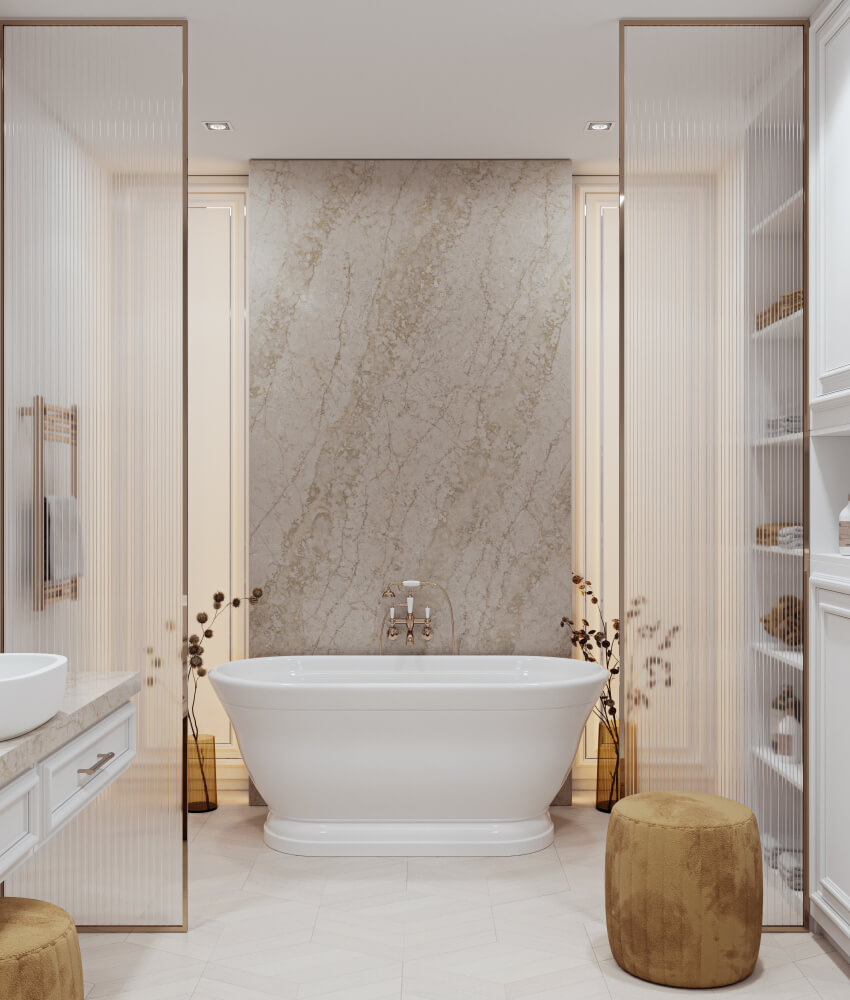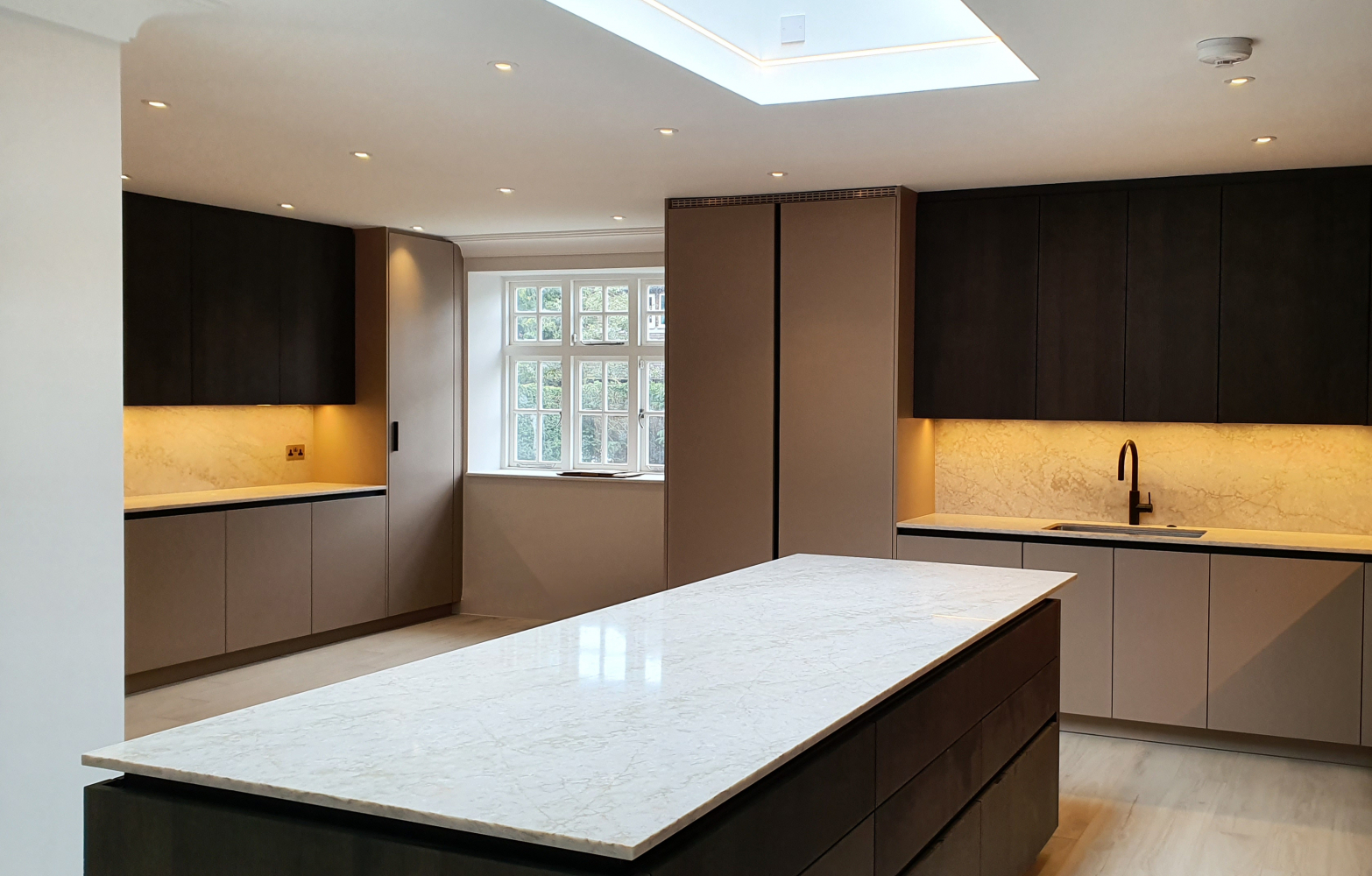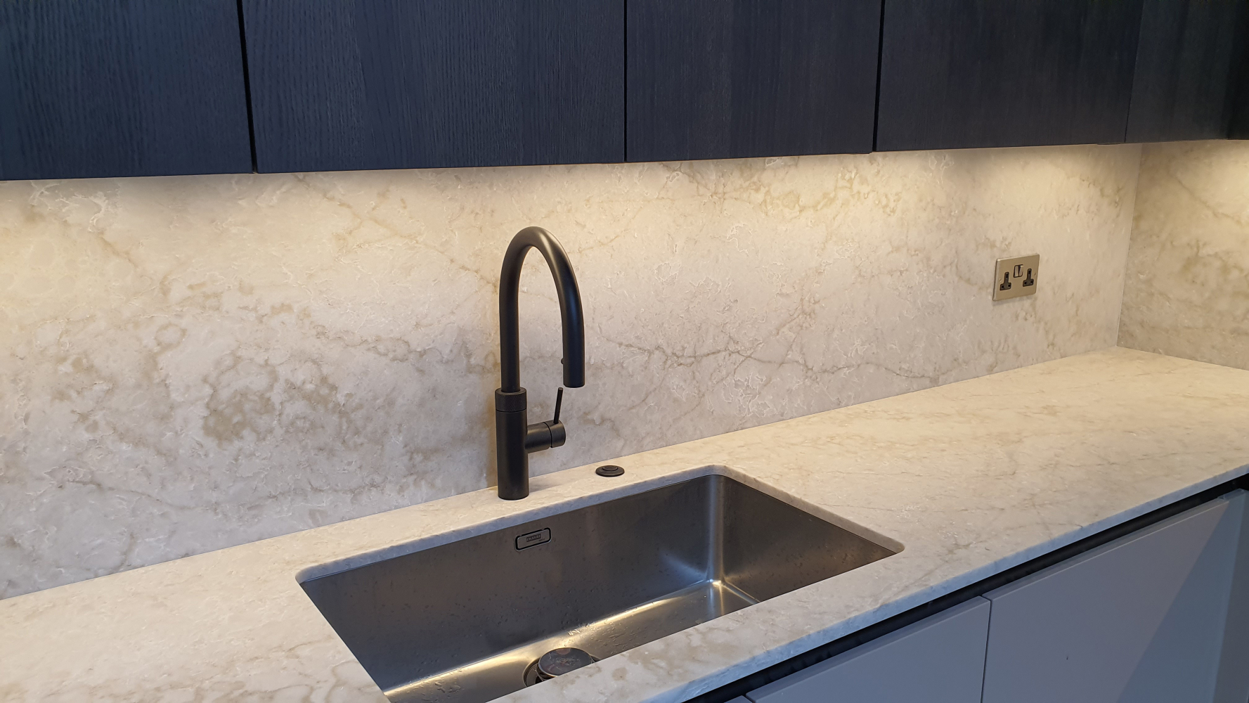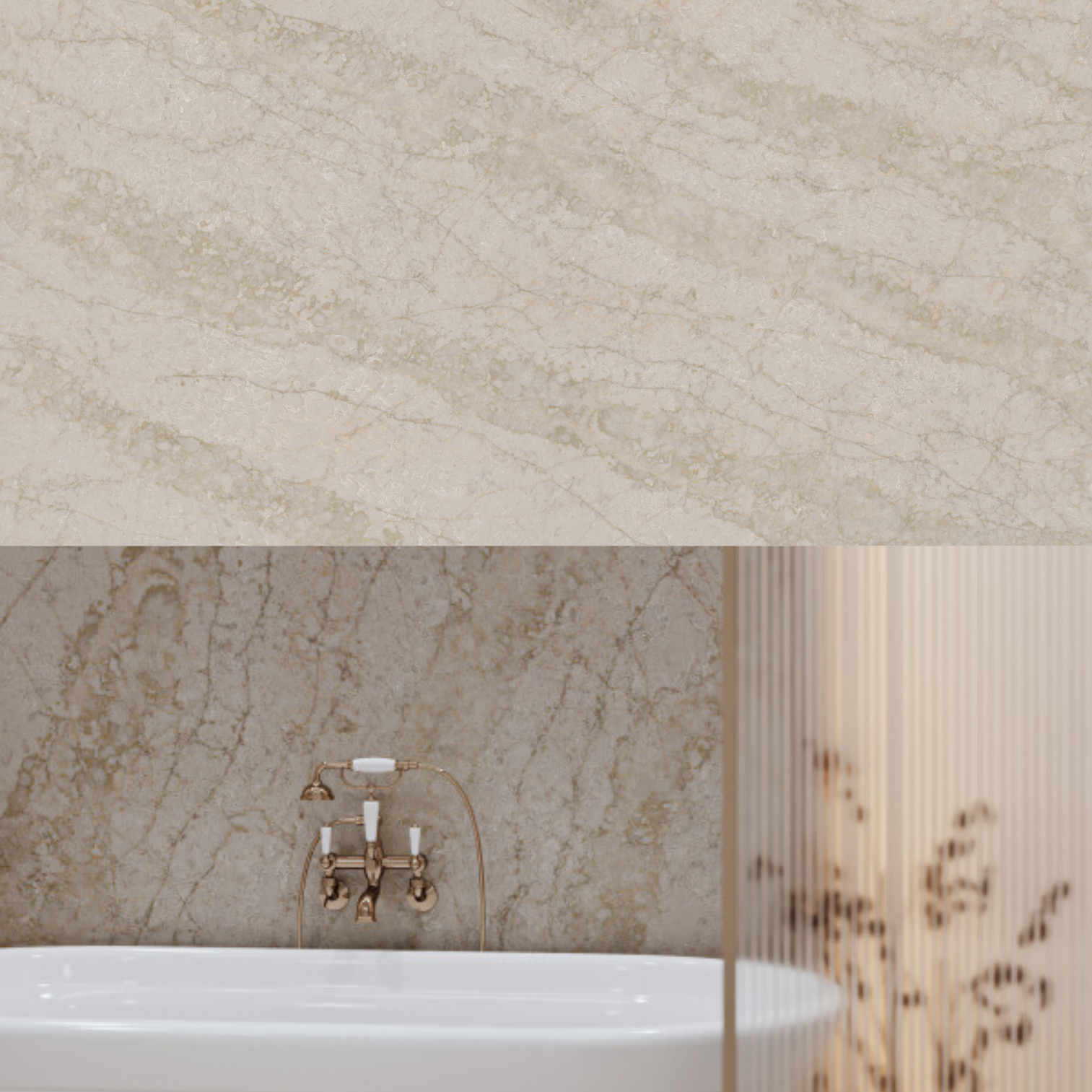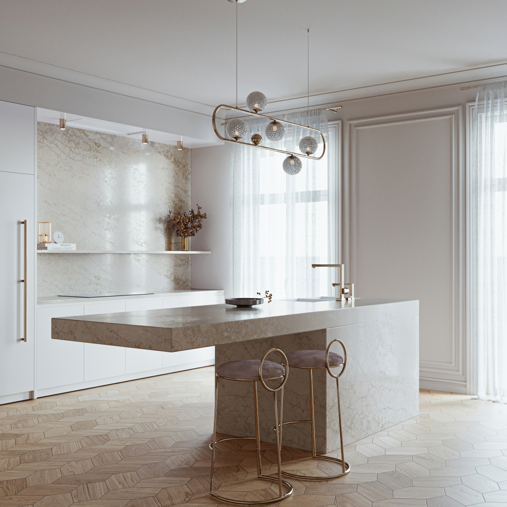 En varm neutral kvartskomposit med cremefarvet marmorering.