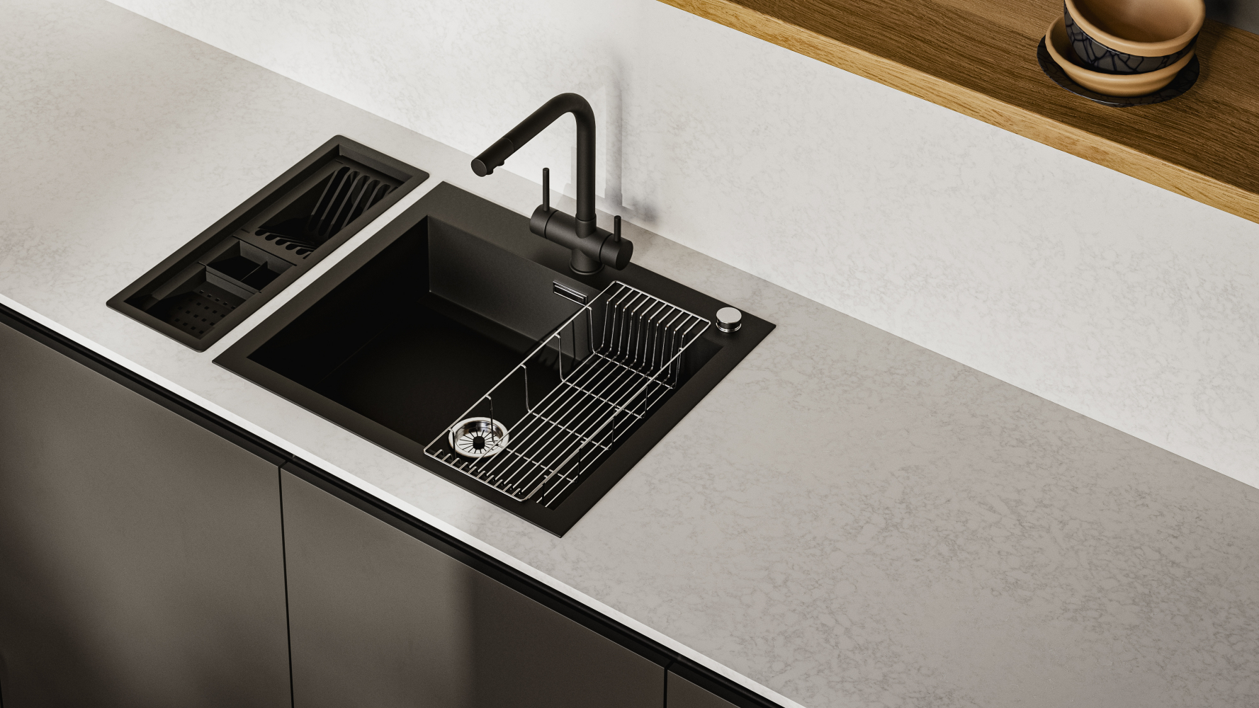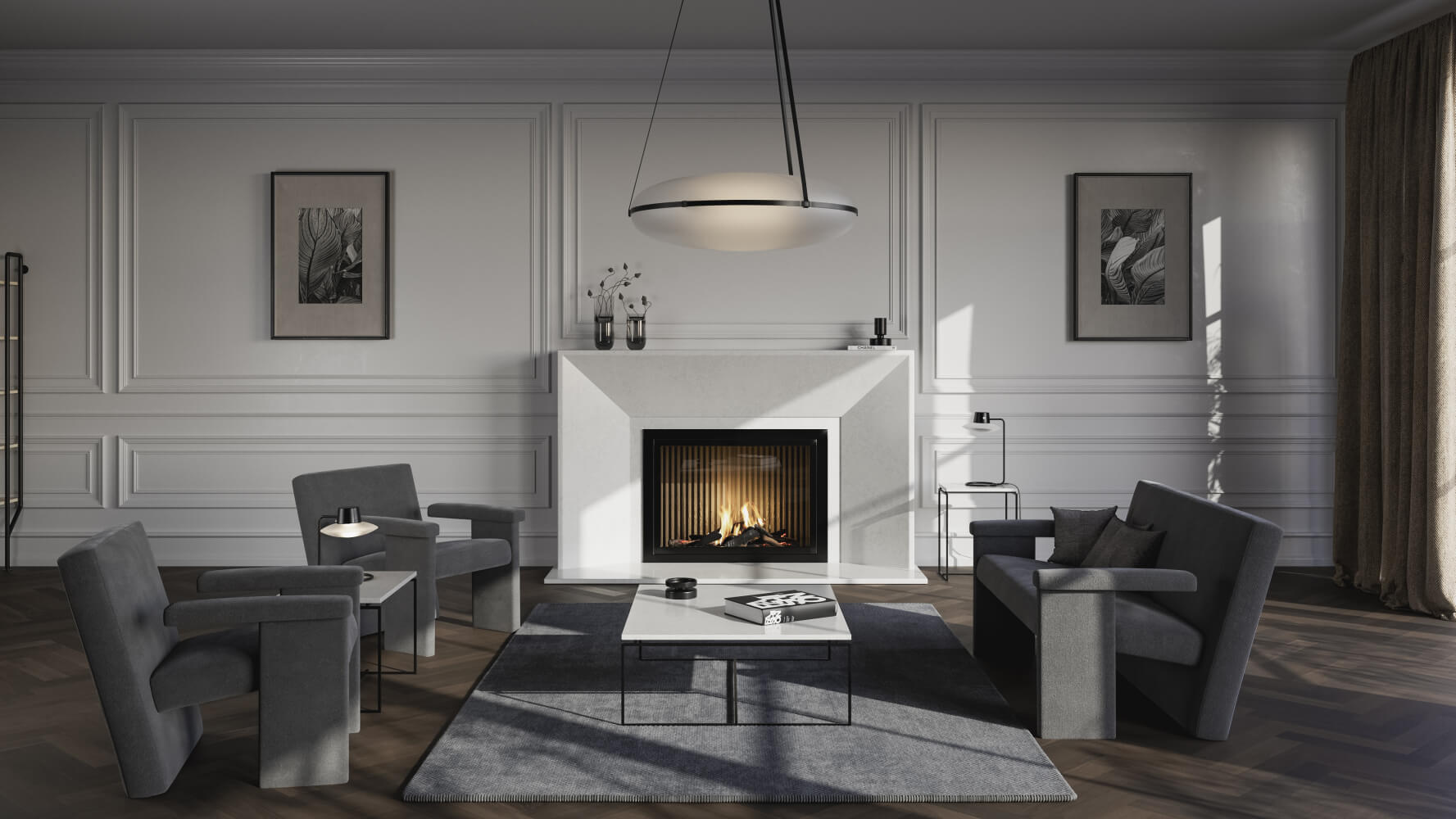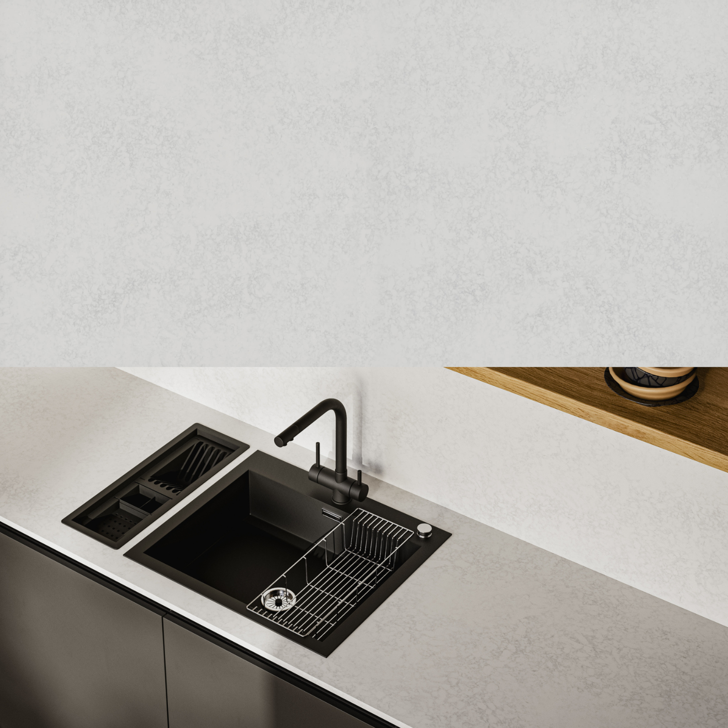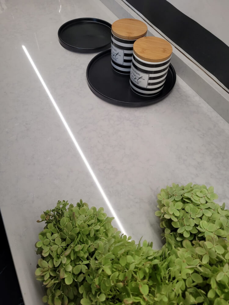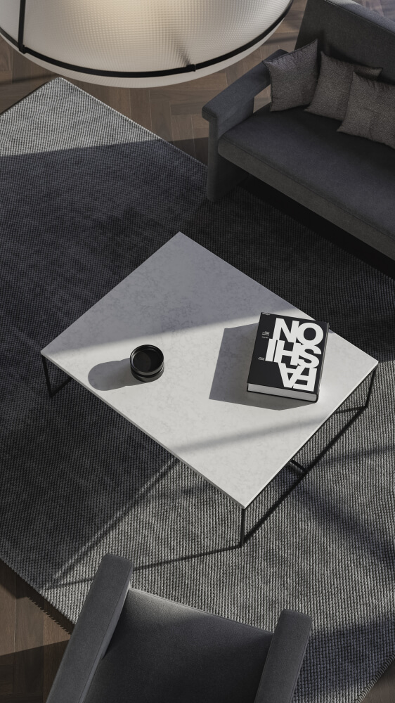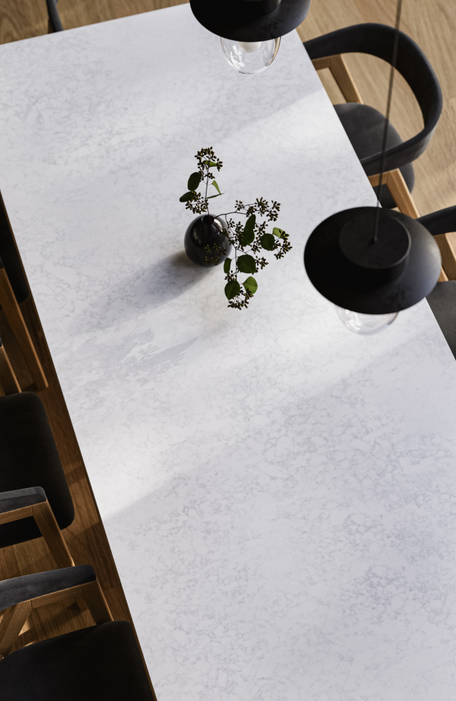 En elegant kvartskomposit med subtilt gråligt mønster.