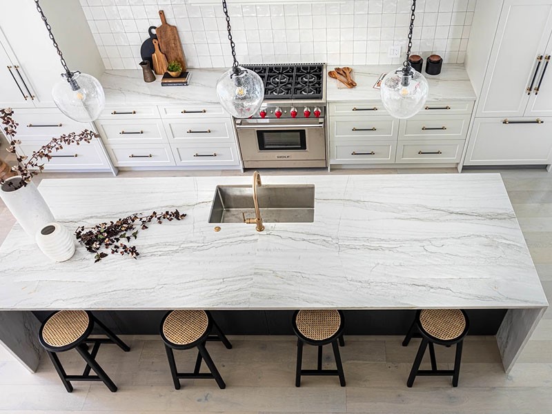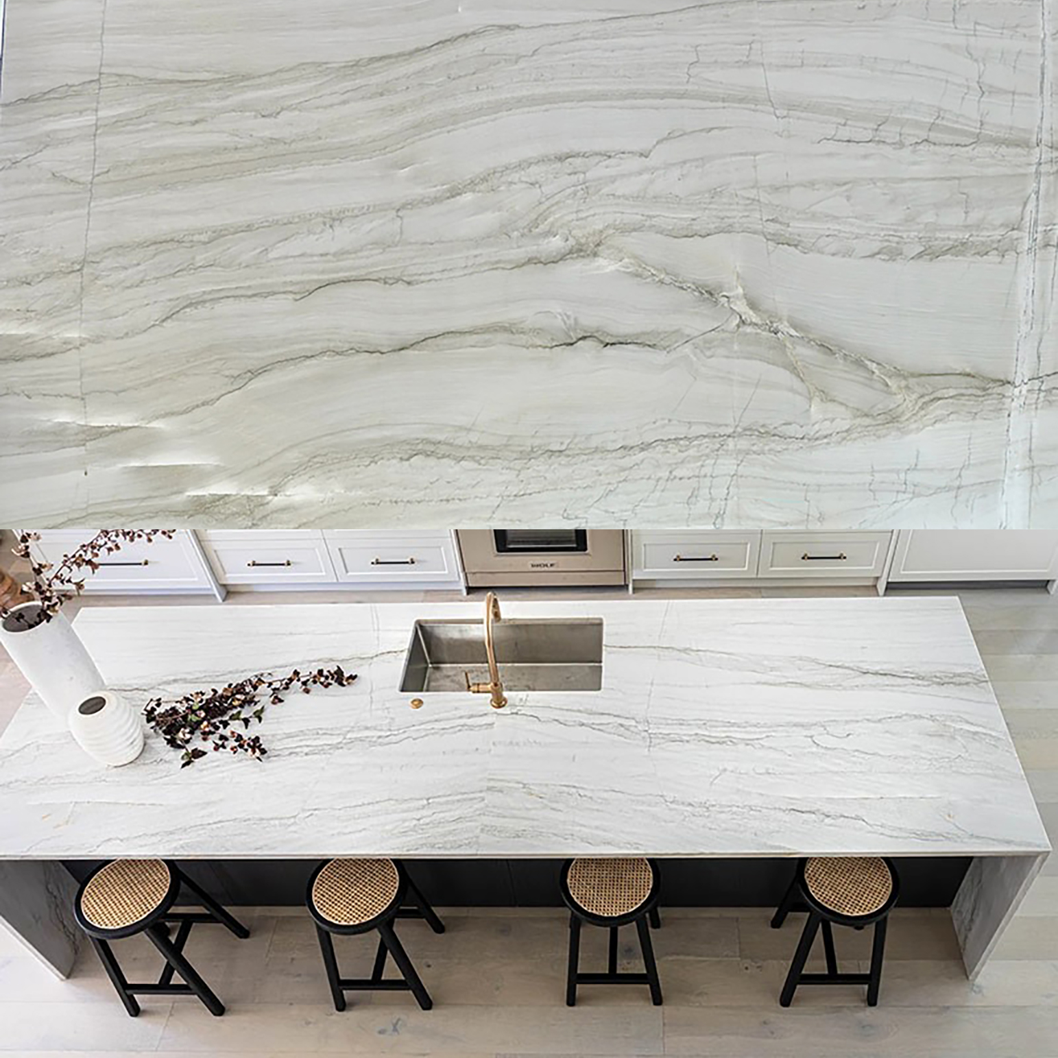 Meget lys beige quartzite, med grå og gyldne nuancer.