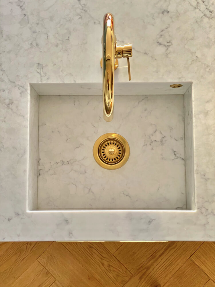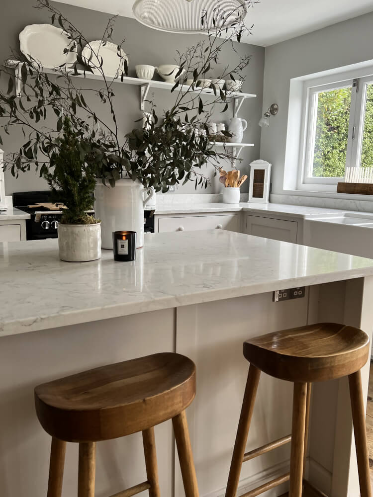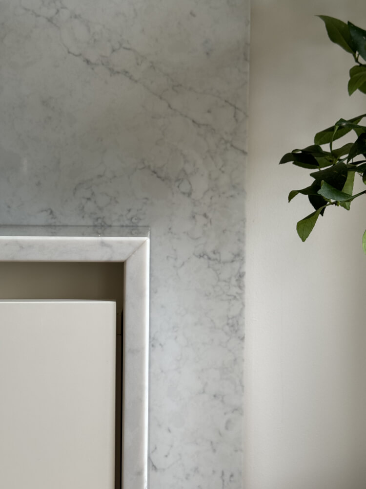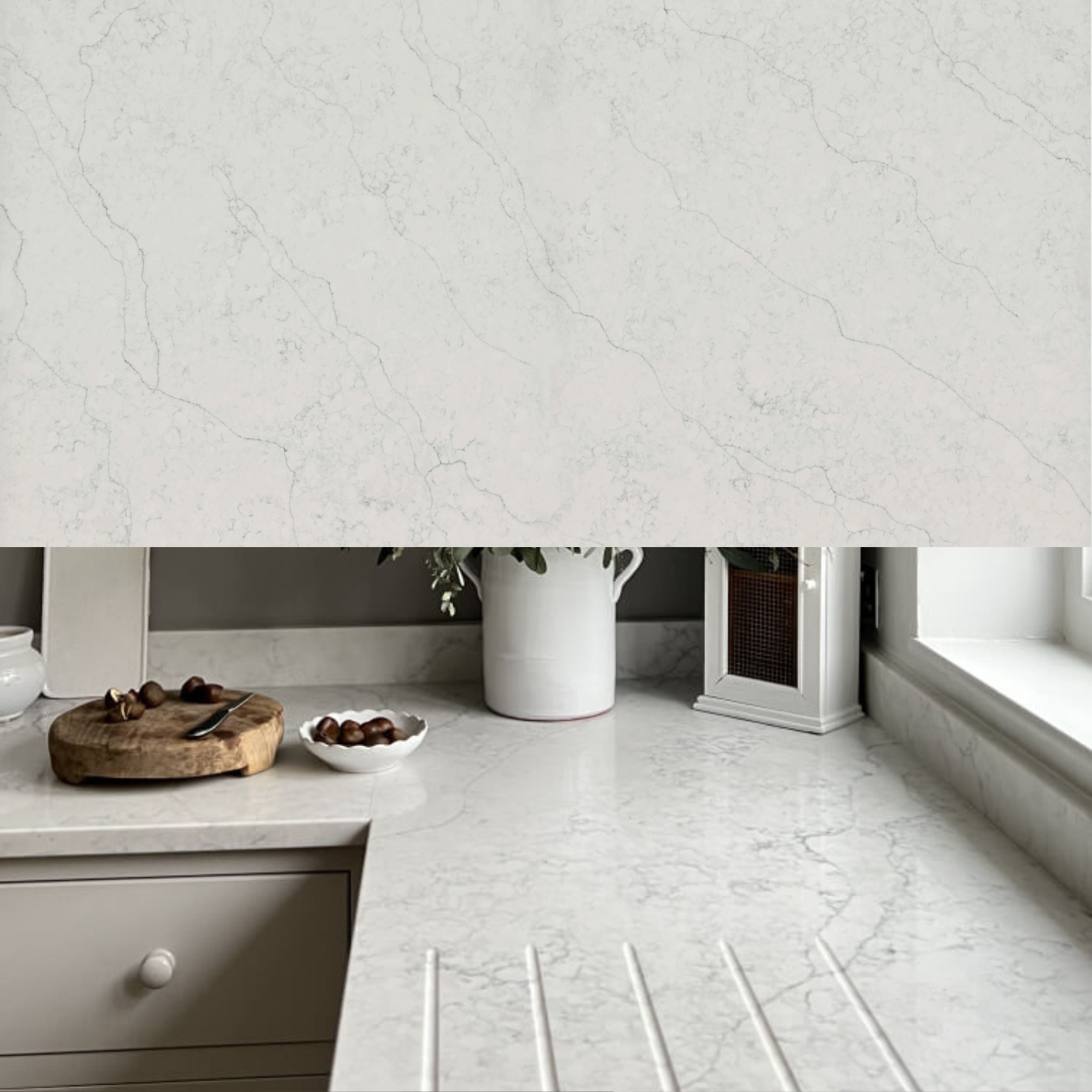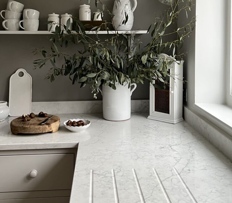 En smuk lys marmor lignende kvartskomposit med grålig åretegning og mønster.